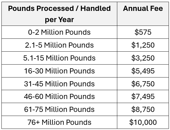 Submit the annual fee to True Source Honey. Upon completion of the third-party audit and certification process, True Source Honey requires payment of an annual fee based on the total pounds of True Source containers processed/handled per year. The current fees are below: